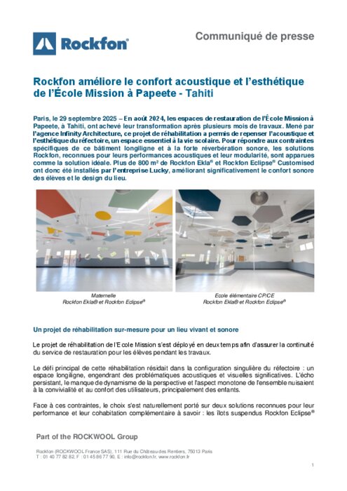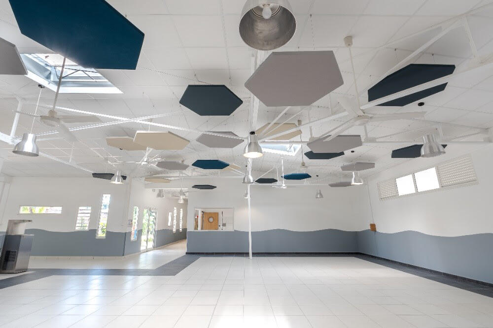 Le projet de réhabilitation de l’Ecole Mission s’est déployé en deux temps afin d’assurer la continuité du service de restauration pour les élèves pendant les travaux. Le défi principal de cette réhabilitation résidait dans la configuration singulière du réfectoire : un espace longiligne, engendrant des problématiques acoustiques et visuelles significatives. L'écho persistant, le manque de dynamisme de la perspective et l'aspect monotone de l'ensemble nuisaient à la convivialité et au confort des utilisateurs, principalement des enfants.