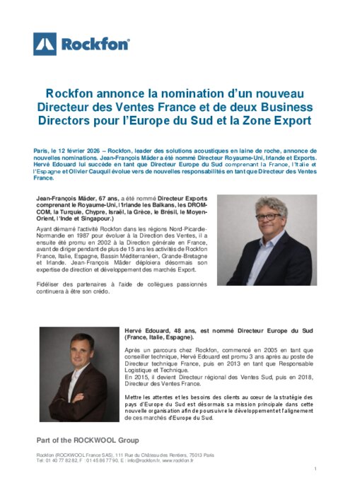 Rockfon, leader des solutions acoustiques en laine de roche, annonce de nouvelles nominations. Jean-François Mäder a été nommé Directeur Royaume-Uni, Irlande et Exports. Hervé Edouard lui succède en tant que Directeur Europe du Sud comprenant la France, l’Italie et l’Espagne et Olivier Cauquil évolue vers de nouvelles responsabilités en tant que Directeur des Ventes France.