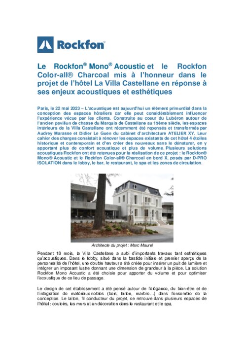 Leur cahier des charges consistait à rénover les espaces existants de cet hôtel 4 étoiles historique et contemporain et d’en créer des nouveaux sans le dénaturer, en y apportant plus de confort acoustique et plus de volume. Plusieurs solutions acoustiques Rockfon ont été retenues pour la réalisation de ce projet : le Rockfon Mono Acoustic et le Rockfon Color-all Charcoal en bord X, posés par D-PRO ISOLATION dans le lobby, le bar, le restaurant, le spa et les zones de circulation.