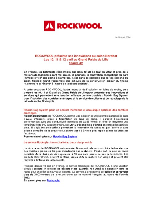 Rockwool, leader mondial de l’isolation en laine de roche, est encore présent ce 12 avril 2024 au Grand Palais de Lille pour présenter ses innovations et services qui permettent une isolation efficace comme durable : Rockin Bag System pour l'isolation des combles aménagés et le service de collecte et de recyclage de la laine de roche Rockcycle.