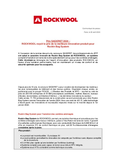 A l’occasion de la remise des prix du concours SAGERET, les professionnels du BTP ont salué le caractère innovant de Rockin Bag System de ROCKWOOL, un système complet d’isolation en laine de roche spécialement conçu pour les combles aménagés. Cette récompense témoigne de l’esprit d’innovation des produits ROCKWOOL en faveur d’une isolation performante, tout en maintenant un niveau de confort et de sécurité optimale pour les occupants.