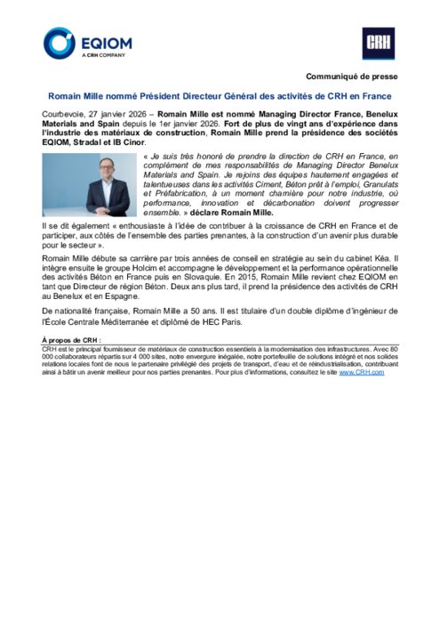 Romain Mille nommé Président Directeur Général des activités de CRH en France