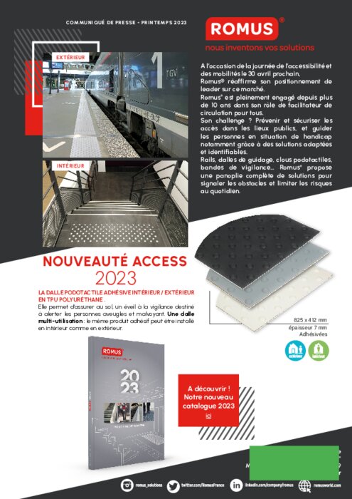 Industriels 14 avril 2023 - 08:22 Rails, dalles de guidage, clous podotactiles, bandes de vigilance... Romus propose une panoplie complète de solutions pour signaler les obstacles et limiter les risques au quotidien. PDF (9 Mo) Télécharger