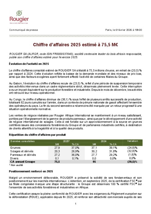 Le chiffre d’affaires consolidé estimé de Rougier s’établit à 75,5 M€, en retrait de -20,5 % par rapport à 2024. Cette évolution reflète la baisse de la demande mondiale et des niveaux de prix bas, ainsi que des facteurs exogènes ayant fortement affecté l’activité de certaines filiales du Groupe.