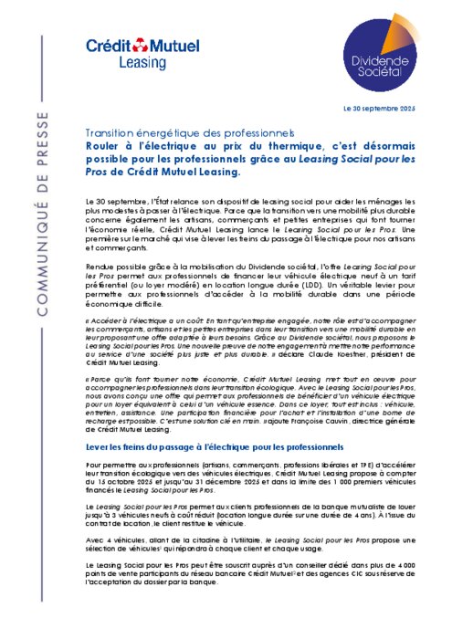 Rendue possible grâce à la mobilisation du Dividende sociétal, l’offre Leasing Social pour les Pros permet aux professionnels de financer leur véhicule électrique neuf à un tarif préférentiel (ou loyer modéré) en location longue durée (LDD). Un véritable levier pour permettre aux professionnels d’accéder à la mobilité durable dans une période économique difficile