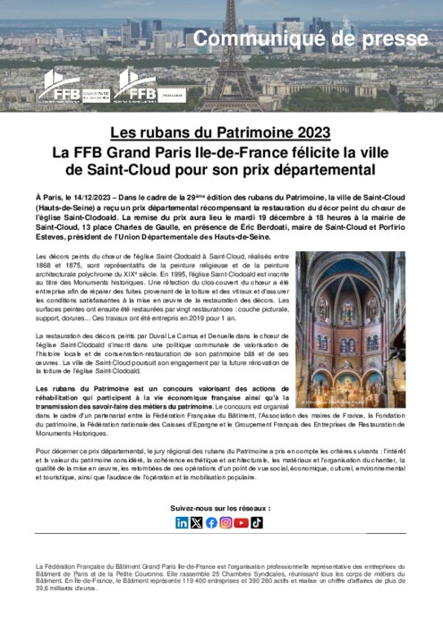 Dans le cadre de la 29e édition des rubans du Patrimoine, la ville de Saint-Cloud (Hauts-de-Seine) a reçu un prix départemental récompensant la restauration du décor peint du chœur de l'église Saint-Clodoald.
