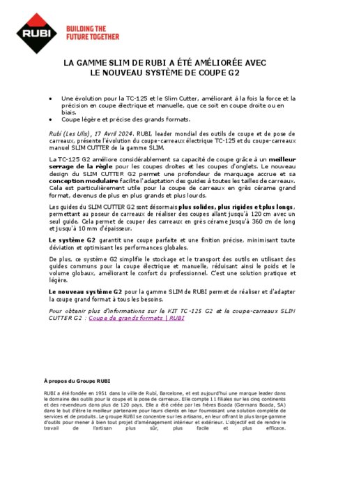 Industriels 17 avril 2024 - 12:25 RUBI, leader mondial des outils de coupe et de pose de carreaux, présente l'évolution du coupe-carreaux électrique TC-125 et du coupe-carreaux manuel SLIM CUTTER de la gamme SLIM. PDF (84 Ko) Télécharger Crédits : Rubi