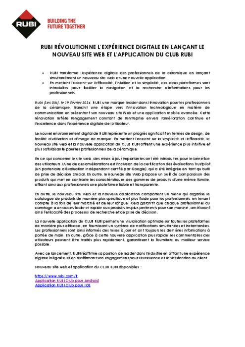 RUBI, une marque leader dans l'innovation pour les professionnels de la céramique, franchit une étape vers l'innovation technologique en matière de communication en présentant son nouveau site Web et une application mobile avancée. Cette rénovation reflète l'engagement constant de l'entreprise envers l'amélioration continue et l'excellence dans l'expérience digitale de l'utilisateur.