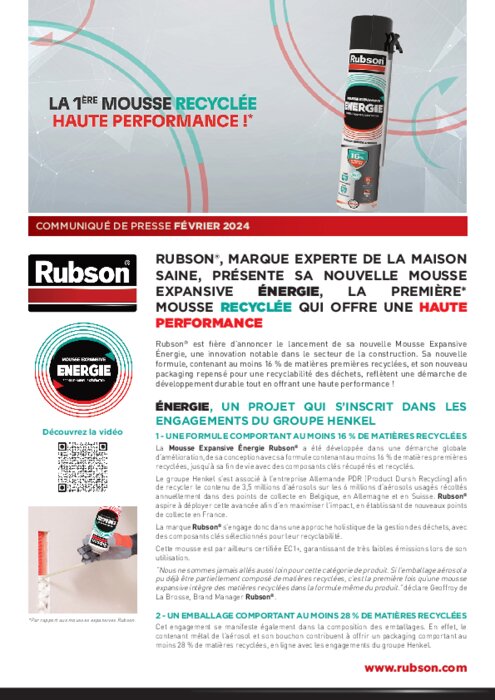 Rubson est fière d’annoncer le lancement de sa nouvelle Mousse Expansive Énergie, une innovation notable dans le secteur de la construction. Sa nouvelle formule, contenant au moins 16 % de matières premières recyclées, et son nouveau packaging repensé pour une recyclabilité des déchets, reflètent une démarche de développement durable tout en offrant une haute performance.
