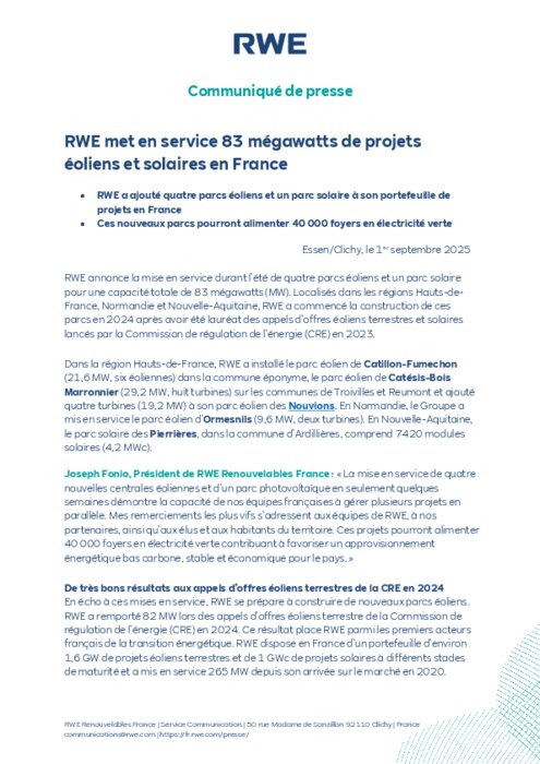 RWE annonce la mise en service durant l’été de quatre parcs éoliens et un parc solaire pour une capacité totale de 83 mégawatts (MW). Localisés dans les régions Hauts-de-France, Normandie et Nouvelle-Aquitaine, RWE a commencé la construction de ces parcs en 2024 après avoir été lauréat des appels d’offres éoliens terrestres et solaires lancés par la Commission de régulation de l’énergie (CRE) en 2023.