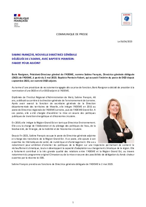 Boris Ravignon, Président-Directeur général de l’ADEME, nomme Sabine François, Directrice générale déléguée (DGD) de l’ADEME, à partir du 2 mai 2023. Baptiste Perrissin-Fabert, qui assurait l’intérim du poste de DGD depuis septembre 2022, est nommé DGD adjoint.