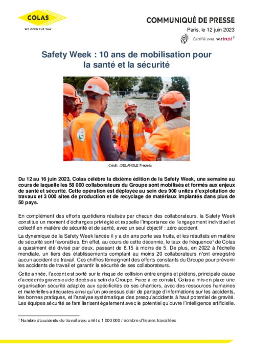 Du 12 au 16 juin 2023, Colas célèbre la dixième édition de la Safety Week, une semaine au cours de laquelle les 58 000 collaborateurs du Groupe sont mobilisés et formés aux enjeux de santé et sécurité. Cette opération est déployée au sein des 900 unités d’exploitation de travaux et 3 000 sites de production et de recyclage de matériaux implantés dans plus de 50 pays.