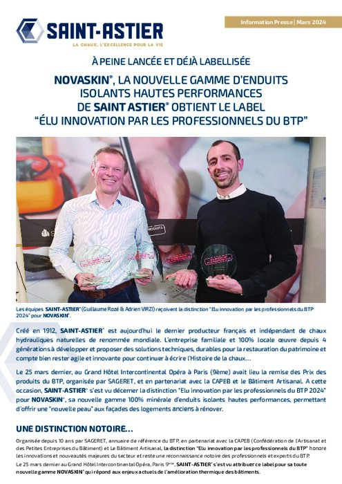 Le 25 mars a lieu la remise des Prix des produits du BTP, organisée par Sageret, et en partenariat avec la Capeb et Le Bâtiment Artisanal. À cette occasion, Saint-Astier s’est vu décerner la distinction “Elu innovation par les professionnels du BTP 2024” pour Novaskin, sa nouvelle gamme 100 % minérale d’enduits isolants hautes performances, permettant d’offrir une “nouvelle peau” aux façades des logements anciens à rénover.