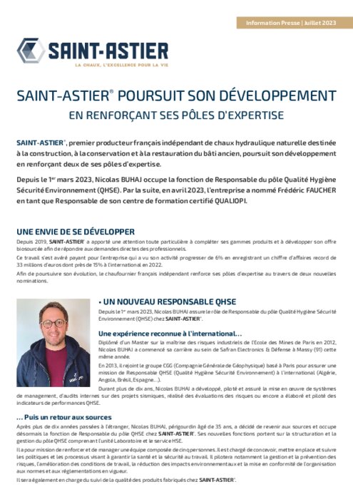 Saint-Astier poursuit son développement en renforçant deux de ses pôles d’expertise. Depuis le 1er mars 2023, Nicolas BUHAJ occupe la fonction de Responsable du pôle Qualité Hygiène Sécurité Environnement (QHSE). Par la suite, en avril 2023, l’entreprise a nommé Frédéric FAUCHER en tant que Responsable de son centre de formation certifié QUALIOPI.