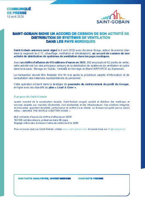 Saint-Gobain annonce avoir signé le 9 avril avec Airvance Group, acteur de premier plan dans le segment du CVC (chauffage, ventilation et climatisation), un accord de cession de son activité de distribution de systèmes de ventilation dans les pays nordiques.