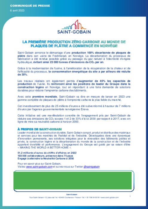 Saint-Gobain annonce le démarrage d’une production 100% décarbonée de plaques de plâtre dans son usine de Fredrikstad, en Norvège. La décarbonation du processus de fabrication a été rendue possible grâce au passage du gaz naturel à l’électricité d’origine hydraulique, évitant ainsi 23 000 tonnes d’émissions de CO2 par an.