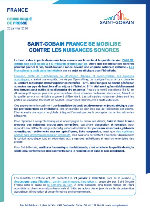 Le bruit a des impacts désormais bien connus sur la santé et la qualité de vie : l’ADEME estime son coût social à 147 milliards d’euros par an. Alors que les nuisances sonores peuvent gâcher la vie, Saint-Gobain France dévoile une enquête nationale intitulée « Les Français et le bruit dans les hôtels » sur ce sujet stratégique pour l’hôtellerie.