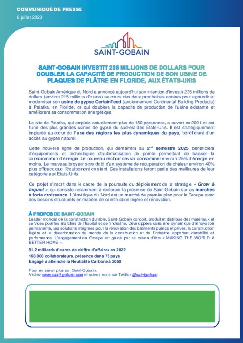 Saint-Gobain Amérique du Nord a annoncé aujourd'hui son intention d'investir 235 millions de dollars (environ 215 millions d’euros) au cours des deux prochaines années pour agrandir et moderniser son usine de gypse CertainTeed (anciennement Continental Building Products) à Palatka, en Floride, ce qui doublera la capacité de production de l'usine existante et améliorera sa consommation énergétique.