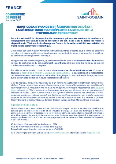 Face à la nécessité de disposer d’outils de mesure renforçant la confiance et l’engagement des acteurs dans la rénovation du bâti, Saint-Gobain met à disposition de l’État les droits d’usage en France de la méthode QUB®, une solution innovante de mesure de la performance énergétique réelle des bâtiments. Cette démarche s’inscrit dans la volonté de Saint-Gobain d’accompagner la transition énergétique du secteur du bâtiment et de contribuer à une rénovation plus efficace et plus fiable.