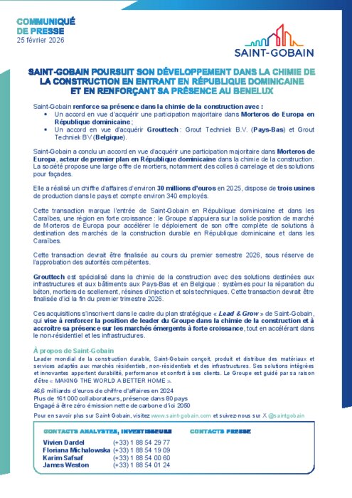 Saint-Gobain a conclu un accord en vue d’acquérir une participation majoritaire dans Morteros de Europa, acteur de premier plan en République dominicaine dans la chimie de la construction. La société propose une large offre de mortiers, notamment des colles à carrelage et des solutions pour façades.
