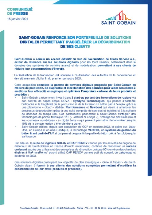 Saint-Gobain a conclu un accord définitif en vue de l’acquisition de Glass Service a.s., acteur de référence sur les solutions digitales pour les fours verriers, notamment dans le domaine des systèmes de contrôle avancé et de modélisation, permettant à ses clients de réduire leur consommation d’énergie.
