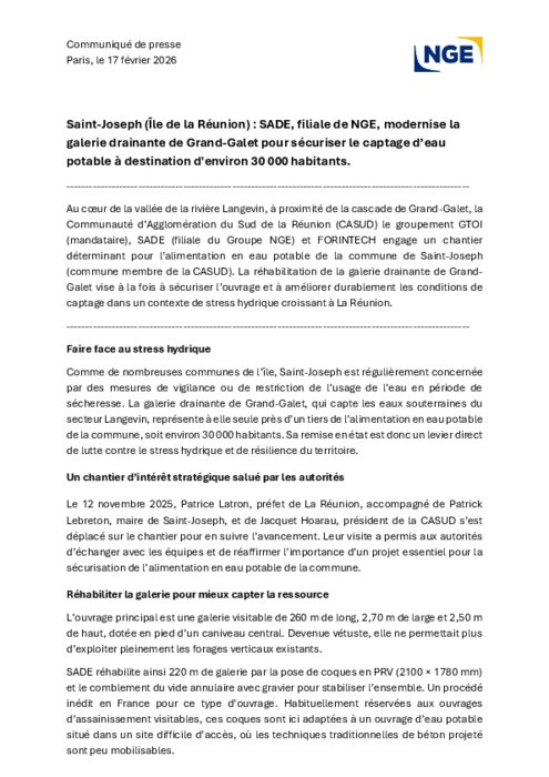 Dans un contexte de tensions récurrentes sur la ressource à La Réunion, le groupement GTOI (mandataire), SADE (filiale de NGE) et FORINTECH conduit un chantier stratégique visant à moderniser 220 mètres de galerie, créer de nouveaux forages et sécuriser durablement le captage.