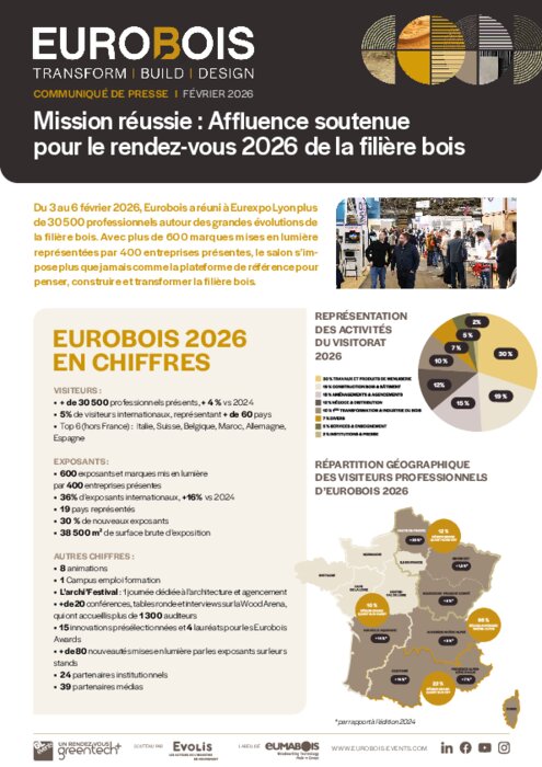 Services 20 février 2026 - 14:42 L’édition 2026 d’Eurobois s’est achevée sur une dynamique particulièrement forte, confirmant le rôle du salon comme rendez-vous de référence des professionnels du bois. PDF (2 Mo) Télécharger credit Eurobois