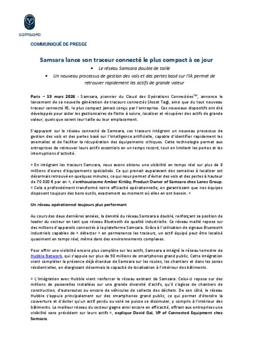 Samsara, pionnier du Cloud des Opérations Connectées, annonce le lancement de sa nouvelle génération de traceurs connectés (Asset Tag), ainsi que du tout nouveau traceur connecté XS, le plus compact jamais conçu par l’entreprise. Ces nouveaux dispositifs ont été développés pour aider les gestionnaires de flotte à suivre, localiser et récupérer des actifs de grande valeur, quels que soient leur taille ou leur emplacement.