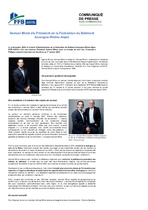 Le 8 décembre 2022, le Conseil d’Administration de la Fédération du Bâtiment Auvergne-Rhône-Alpes (FFB AURA) a élu son nouveau Président, Samuel Minot, pour un mandat de trois ans. Il succède à Philippe Lansard et prendra ses fonctions au 1er janvier 2023.