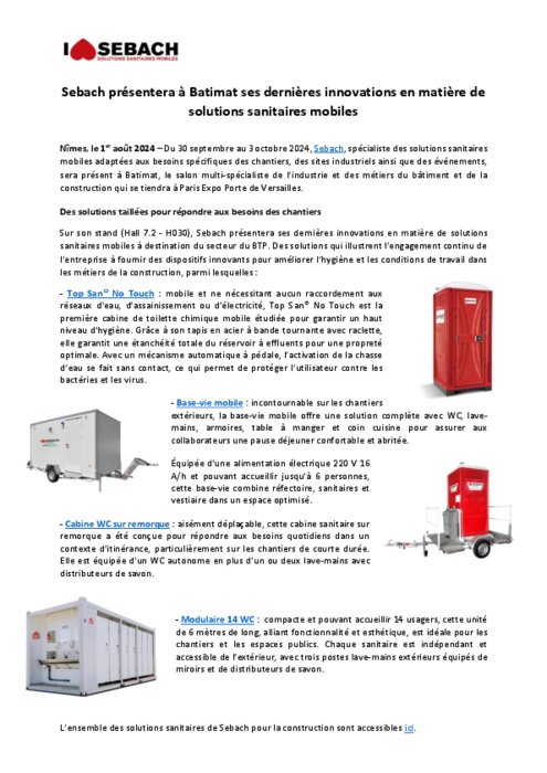 Sanitaires mobiles & chantiers : Sebach présentera ses dernières innovations à Batimat