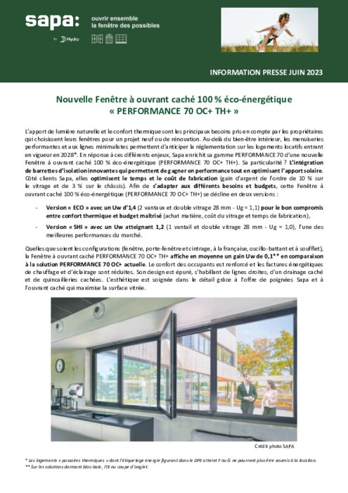 Sapa enrichit sa gamme PERFORMANCE 70 d’une nouvelle Fenêtre à ouvrant caché 100 % éco-énergétique (PERFORMANCE 70 OC+ TH+). Sa particularité ? L’intégration de barrettes d’isolation innovantes qui permettent de gagner en performance tout en optimisant l’apport solaire.