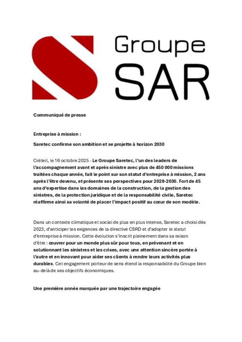 Le Groupe Saretec, l’un des leaders de l’accompagnement avant et après sinistre avec plus de 450 000 missions traitées chaque année, fait le point sur son statut d’entreprise à mission, 2 ans après l’être devenu, et présente ses perspectives pour 2028-2030. Fort de 45 ans d’expertise dans les domaines de la construction, de la gestion des sinistres, de la protection juridique et de la responsabilité civile, Saretec réaffirme ainsi sa volonté de placer l’impact positif au cœur de son modèle.