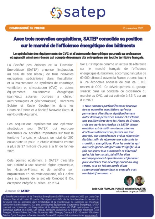 La Société des Artisans de la Transition Énergétique (SATEP) annonce l’intégration, au sein de son réseau, de trois nouvelles entreprises spécialisées dans l’installation et la maintenance de systèmes de chauffage, ventilation et climatisation (CVC), ainsi que d’équipements d’autonomie énergétique tels que les panneaux solaires et les pompes à chaleur aérothermiques et géothermiques : Géotherm Solaire et Opale Géothermie dans les Hauts-de-France, ainsi que la Société Nouvelle Garraud en Nouvelle-Aquitaine.