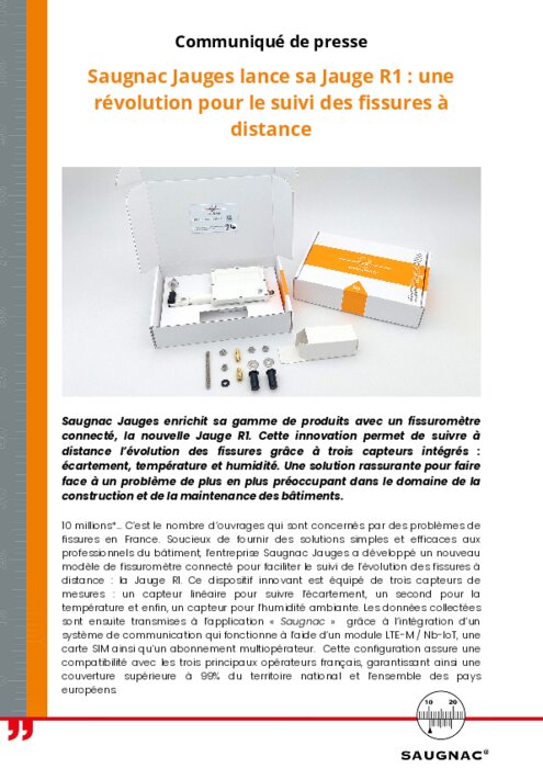 Saugnac Jauges enrichit sa gamme de produits avec un fissuromètre connecté, la nouvelle Jauge R1. Cette innovation permet de suivre à distance l’évolution des fissures grâce à trois capteurs intégrés : écartement, température et humidité. Une solution rassurante pour faire face à un problème de plus en plus préoccupant dans le domaine de la