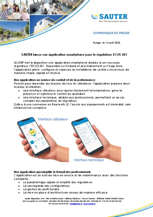 Sauter met à disposition une application smartphone dédiée à son nouveau régulateur, l’ECOS 501. Disponible sur Android et prochainement sur l’App Store, l’application pilote, configure et supervise les installations de ventilo-convecteurs de manière simple, rapide et intuitive.