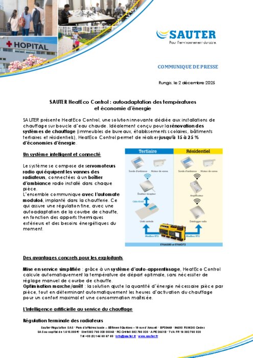 Sauter présente HeatEco Control, une solution innovante dédiée aux installations de chauffage sur boucle d’eau chaude. Idéalement conçu pour la rénovation des systèmes de chauffage (immeubles de bureaux, établissements scolaires, bâtiments tertiaires et résidentiels), HeatEco Control permet de réaliser jusqu’à 15 à 25 % d’économies d’énergie.