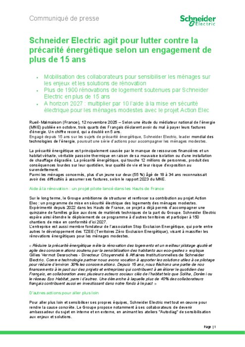 Industriels 12 novembre 2025 - 14:29 Depuis plus de 15 ans, Schneider Electric s’engage aux côtés des acteurs sociaux pour soutenir la rénovation des logements, sécuriser les installations électriques et sensibiliser aux éco-gestes. PDF (154 Ko) Télécharger credit Schneider Electric
