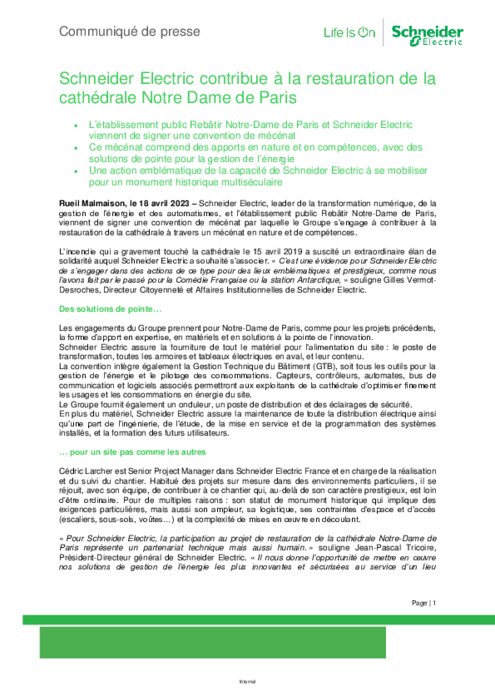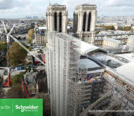 L’incendie qui a gravement touché la cathédrale, il y a plus de 4 ans, a suscité un extraordinaire élan de solidarité auquel Schneider Electric a souhaité s’associer. Le Groupe et l’établissement public Rebâtir Notre-Dame de Paris, viennent de signer une convention de mécénat. Schneider Electric s’engage à contribuer à la restauration de la cathédrale à travers un mécénat en nature et de compétences.