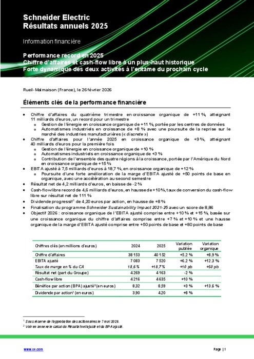 Chiffre d’affaires pour l’année 2025 en croissance organique de +9 %, atteignant 40 milliards d’euros pour la première fois. EBITA ajusté à 7,5 milliards d’euros à 18,7 %, en croissance organique de +12 %. Résultat net de 4,2 milliards d’euros, en baisse de -2 %. Objectif 2026 : croissance organique de l’EBITA ajusté comprise entre +10 % et +15 %, basée sur une croissance organique du chiffre d’affaires comprise entre +7 % et +10 % et une hausse organique de la marge d’EBITA ajusté comprise entre +50 points de base et +80 points de base.