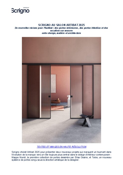 Scrigno choisit Artibat 2025 pour présenter deux nouveaux projets qui marquent un tournant dans l’évolution de la marque vers un rôle toujours plus central dans le design d’intérieur contemporain : Mappa Mundi, la première collection de portes dessinée par Elisa Ossino, et Talos, un nouveau système de portes conçu sous la direction artistique de la designer.