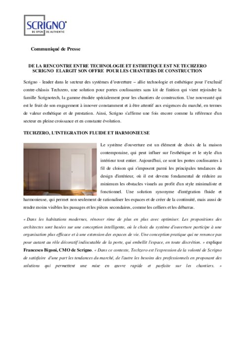 Scrigno - leader dans le secteur des systèmes d’ouverture – allie technologie et esthétique pour l’exclusif contre-châssis Techzero, une solution pour portes coulissantes sans kit de finition qui vient rejoindre la famille Scrignotech, la gamme étudiée spécialement pour les chantiers de construction.