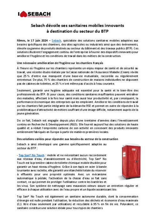 Sebach, spécialiste des solutions sanitaires mobiles adaptées aux besoins spécifiques des chantiers, des sites agricoles ou industriels ainsi que des événements, dévoile sa gamme de produits destinés au secteur du bâtiment et des travaux publics (BTP). Ces solutions illustrent l’engagement continu de l’entreprise à fournir des dispositifs innovants pour