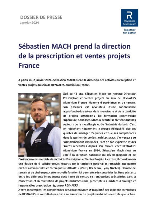 Industriels 23 janvier 2024 - 11:37 A partir du 2 janvier 2024, Sébastien MACH prend la direction des activités prescription et ventes projets au sein de REYNAERS Aluminium France. PDF (159 Ko) Télécharger