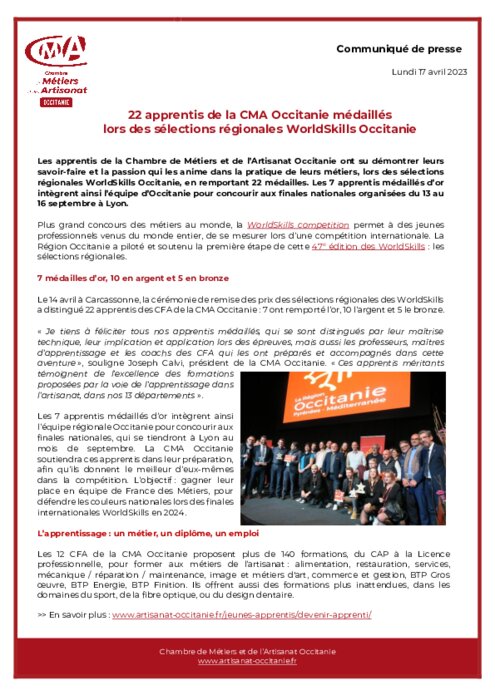 Les apprentis de la Chambre de Métiers et de l’Artisanat Occitanie ont su démontrer leurs savoir-faire et la passion qui les anime dans la pratique de leurs métiers, lors des sélections régionales WorldSkills Occitanie, en remportant 22 médailles. Les 7 apprentis médaillés d’or intègrent ainsi l’équipe d’Occitanie pour concourir aux finales nationales organisées du 13 au 16 septembre à Lyon.