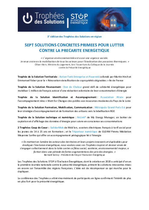 3e édition des Trophées des Solutions en région.« L’urgence environnementale est aussi une urgence sociale. Je veux croire en la mobilisation de tous les acteurs pour l’éradication des passoires thermiques. »