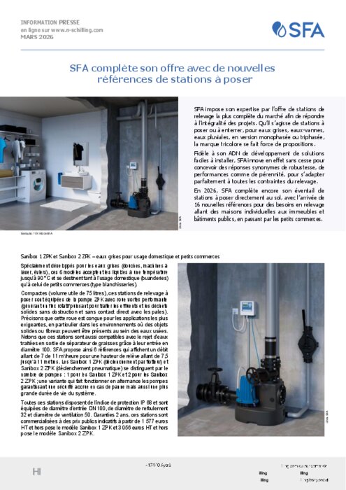 SFA impose son expertise par l’offre de stations de relevage la plus complète du marché afin de répondre à l’intégralité des projets. Qu’il s’agisse de stations à poser ou à enterrer, pour eaux grises, eaux-vannes, eaux pluviales, en version monophasée ou triphasée, la marque tricolore se fait force de propositions.