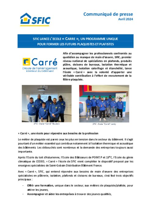 Afin d’accompagner les professionnels confrontés au quotidien au manque de main d’œuvre, SFIC, premier réseau national de spécialistes en plafonds, produits plâtre, cloisons de bureaux, isolation thermique et acoustique, isolation calorifuge et étanchéité, lance l’école « Carré » avec la volonté d’apporter une véritable contribution à l’effort de recrutement de la filière plaquiste.