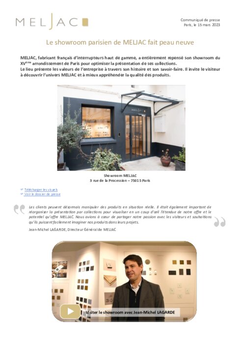 Industriels 15 mars 2023 - 10:19 MELJAC, fabricant français d’interrupteurs haut de gamme, a entièrement repensé son showroom du XVème arrondissement de Paris pour optimiser la présentation de ses collections. PDF (537 Ko) Télécharger