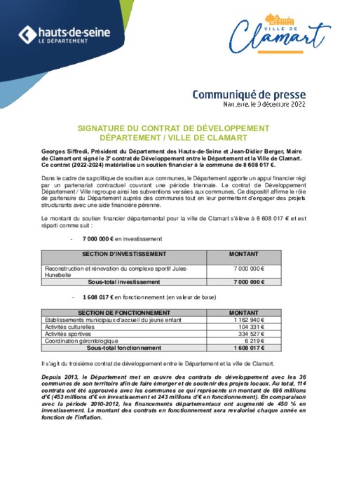 Georges Siffredi, Président du Département des Hauts-de-Seine et Jean-Didier Berger, Maire de Clamart ont signé le 3e contrat de Développement entre le Département et la Ville de Clamart. Ce contrat (2022-2024) matérialise un soutien financier à la commune de 8 608 017 €.