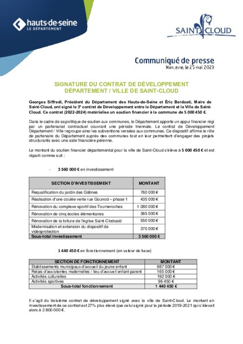 Georges Siffredi, Président du Département des Hauts-de-Seine et Éric Berdoati, Maire de Saint-Cloud, ont signé le 3 e contrat de Développement entre le Département et la Ville de Saint-Cloud. Ce contrat (2022-2024) matérialise un soutien financier à la commune de 5 000 450 €.